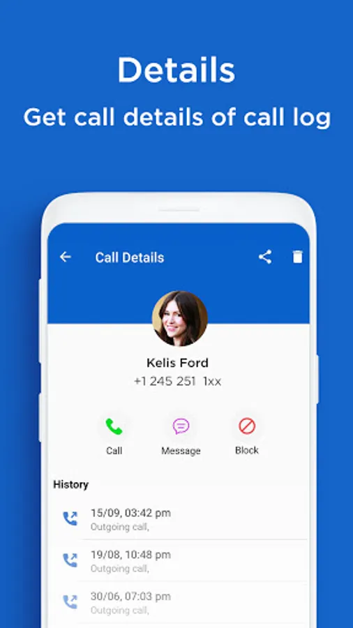 4) Manage Call Logs: Conveniently find your detailed calling history & recent calls, including your missed calls, incoming and outgoing calls with the date & call duration. You can also find a history of incoming, outgoing & missed calls from your favorite contacts. You can also easily share or delete any call log.