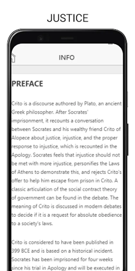 CRITO PLATO - READ & PLAY is a conversation between Socrates and a rich friend of his, Crito concerning justice and injustice. This works of Plato is refering to the events play in the accusation and prison sentences to Socrates as recorded by Plato in his books.