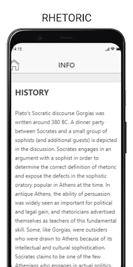 A dinner party between Socrates and a small group of sophists (and additional guests) is depicted in the discussion. Socrates engages in an argument with a sophist in order to determine the correct definition of rhetoric and expose the defects in the sophistic oratory popular in Athens at the time. In antique Athens, the ability of persuasion was widely seen as important for political and legal gain, and rhetoricians advertised themselves as teachers of this fundamental skill. Some, like Gorgias, were outsiders who were drawn to Athens because of its intellectual and cultural sophistication. Socrates claims to be one of the few Athenians who engages in actual politics.