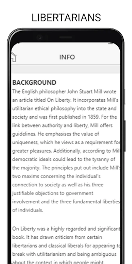 It incorporates Mill's utilitarian ethical philosophy into the state and society and was first published in 1859. For the link between authority and liberty, Mill offers guidelines. He emphasises the value of uniqueness, which he views as a requirement for greater pleasures. Additionally, according to Mill, democratic ideals could lead to the tyranny of the majority. The principles put out include Mill's two maxims concerning the individual's connection to society as well as his three justifiable objections to government involvement and the three fundamental liberties of individuals.