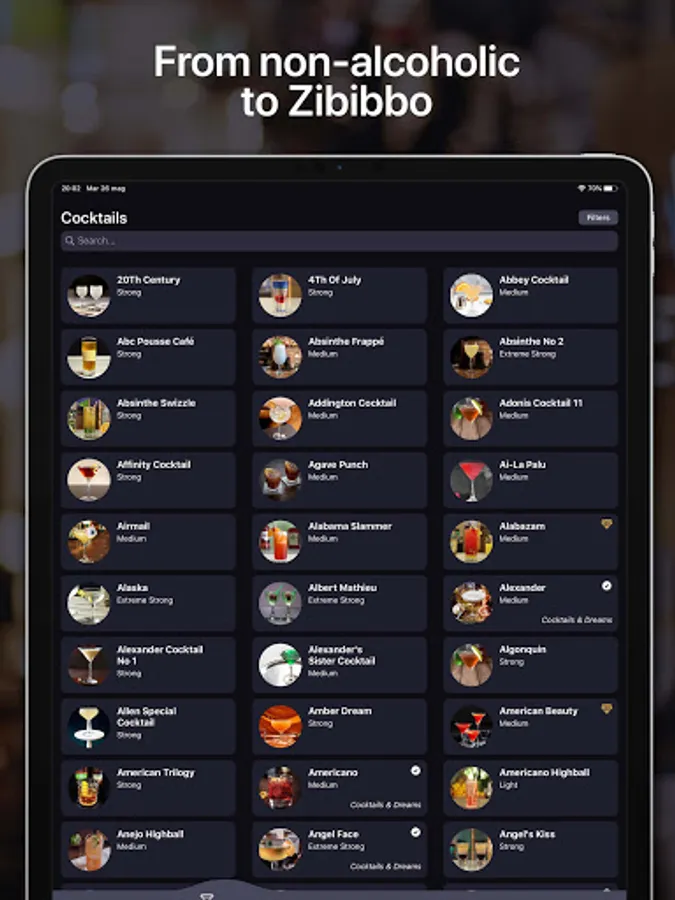 • Cocktails divided into practical categories from Non-alcoholic to Zibibbo.