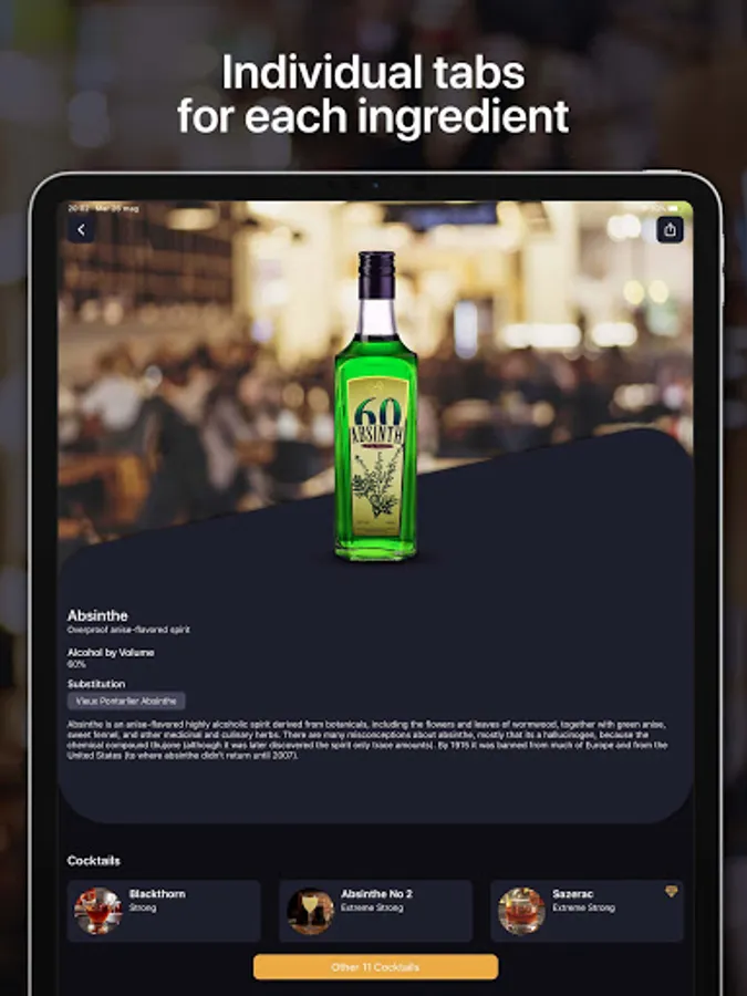 • Each cocktail has its description of the procedure, taste, intensity, and the right glass in which to serve it.