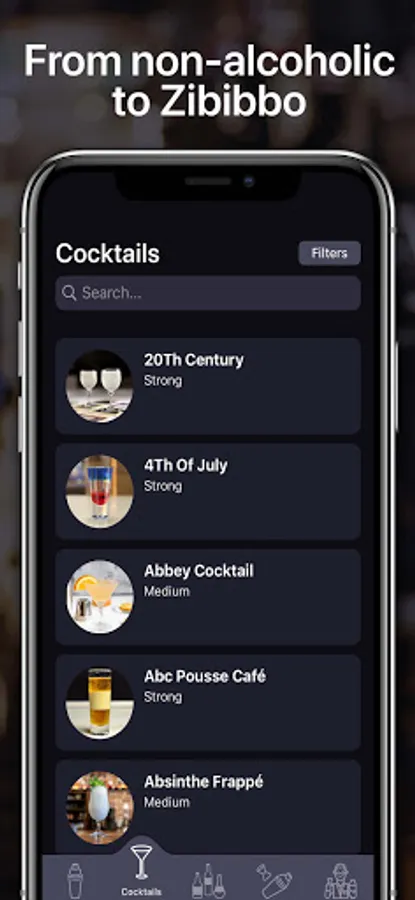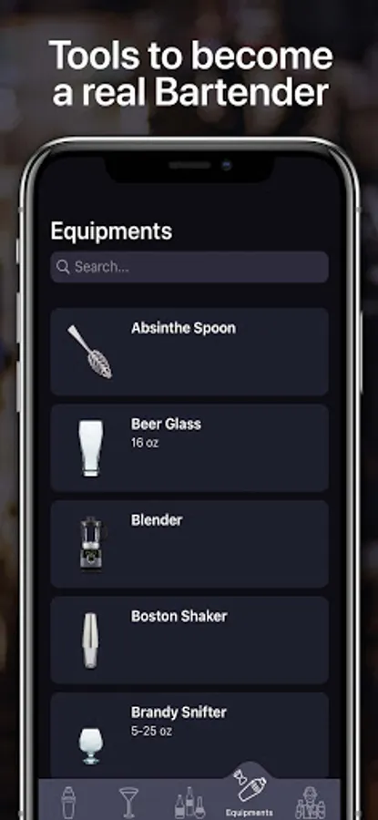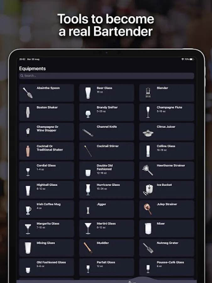 • "Smart" search, that is what you want in a second. Just search for a word and the contents will be filtered, both for cocktails and for instruments, bartenders, clubs, in short, everything!