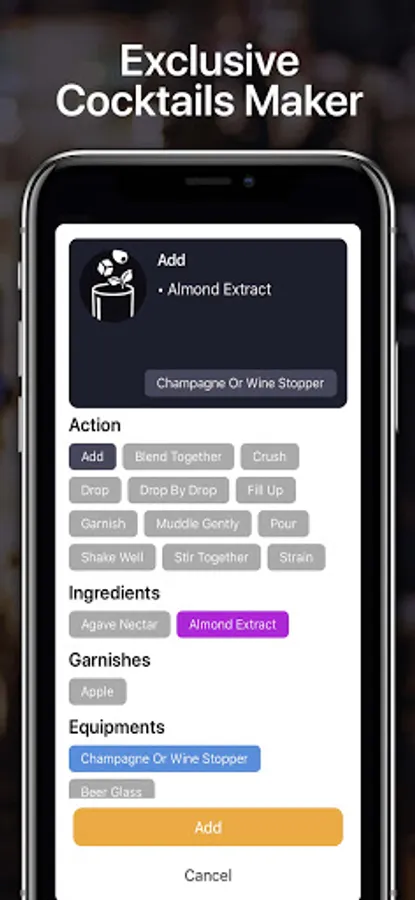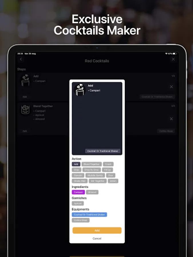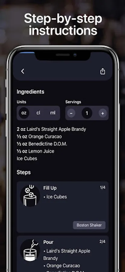 • "Step-by-step" every single step of making the cocktail is exemplified through a precise icon, in a short time you just need to read the ingredients and take a quick look to make your perfect cocktail.