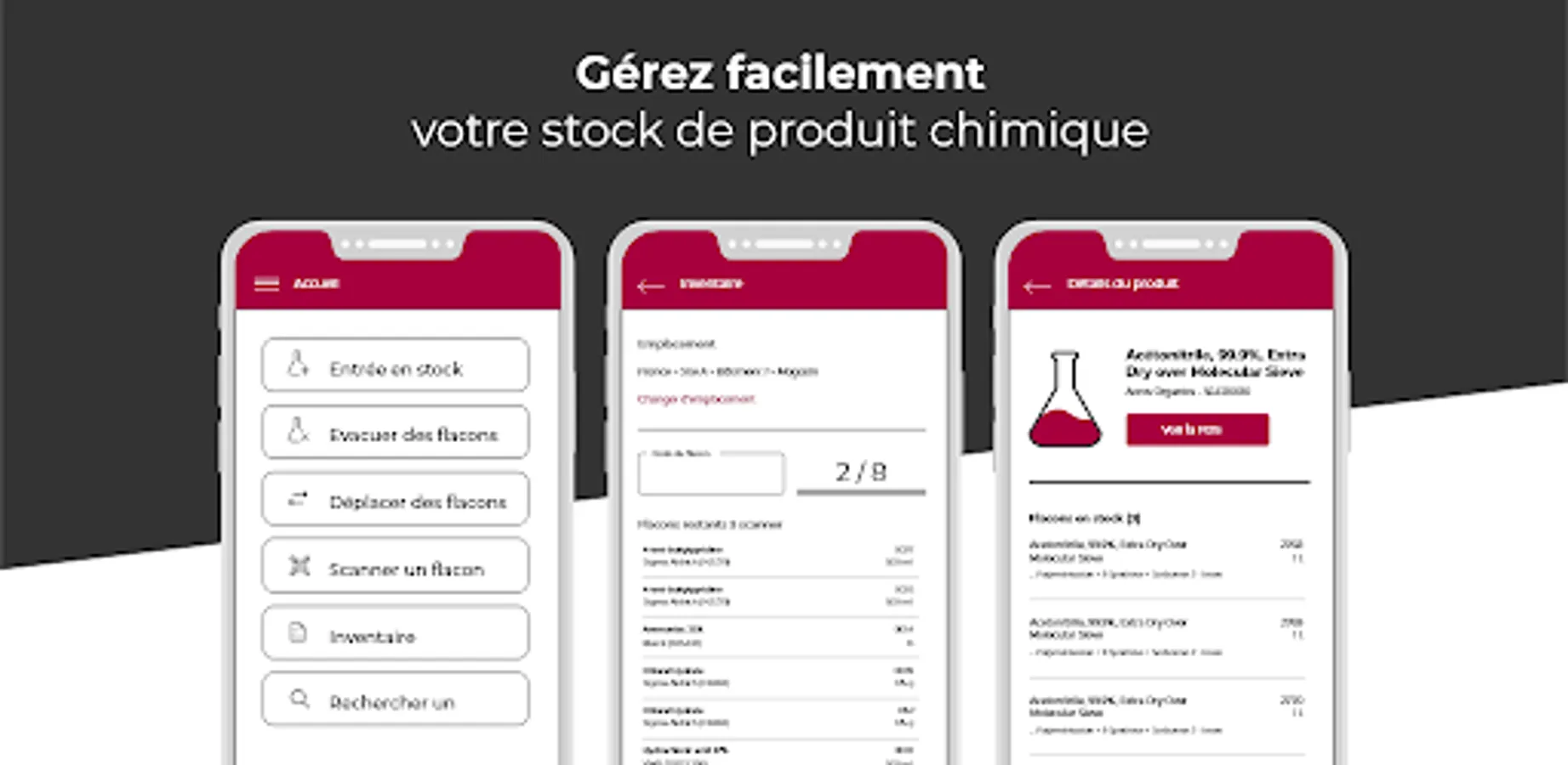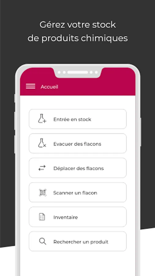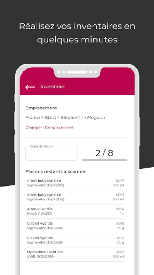 From the application, you can search for a bottle in all of your buildings, know your stock in real time and consult the danger information of your products.