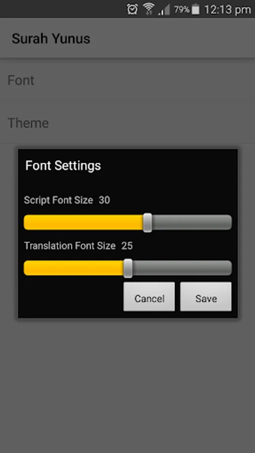 • Adjustable font size for both Arabic script and translation.