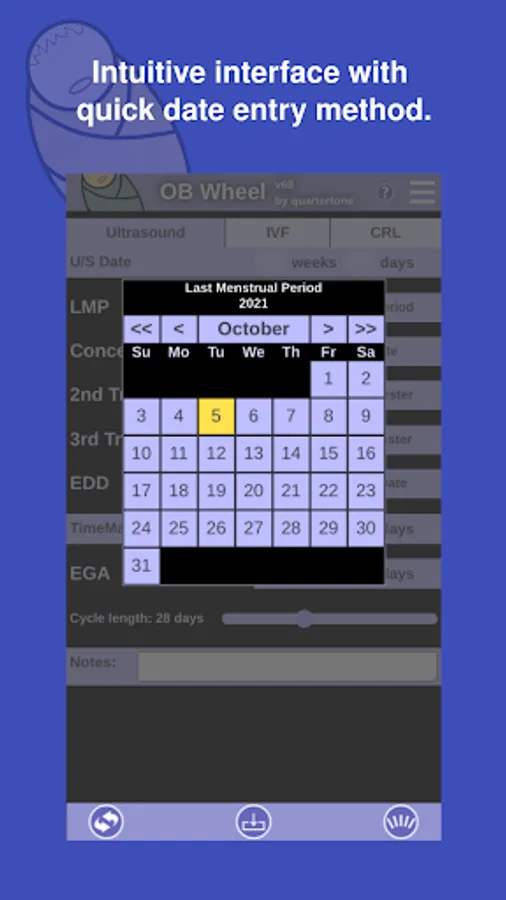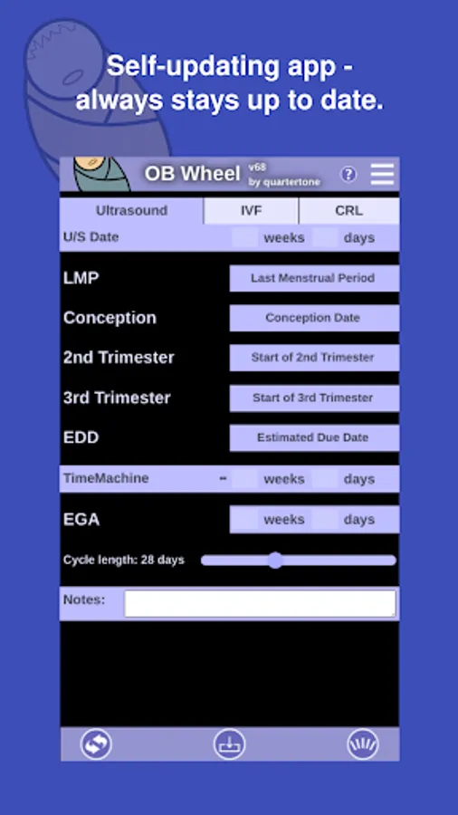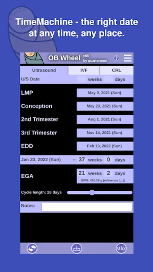 - "Time Machine" mode can calculate "How many weeks will patient be on xxxx date?" and "When will patient be xx weeks gestation?"