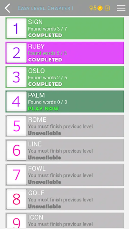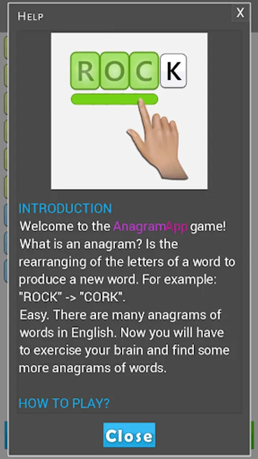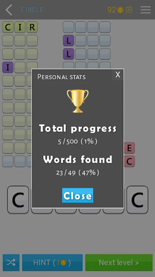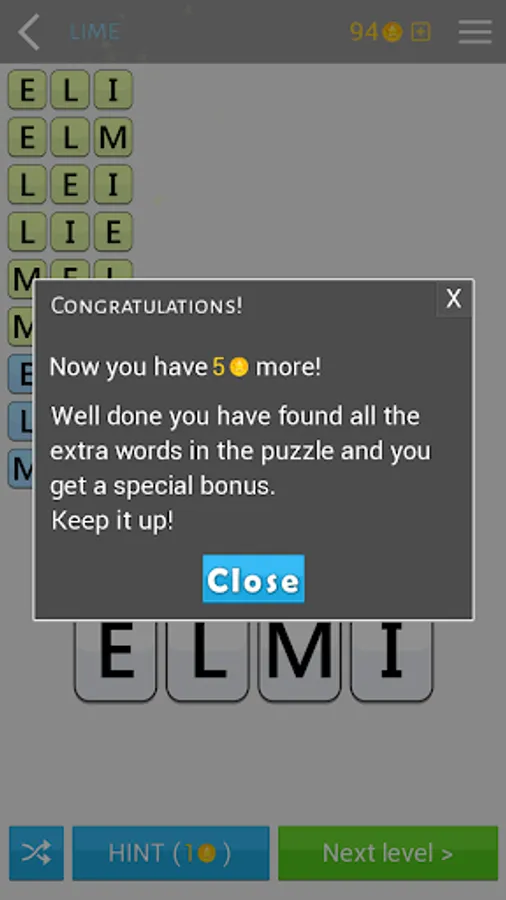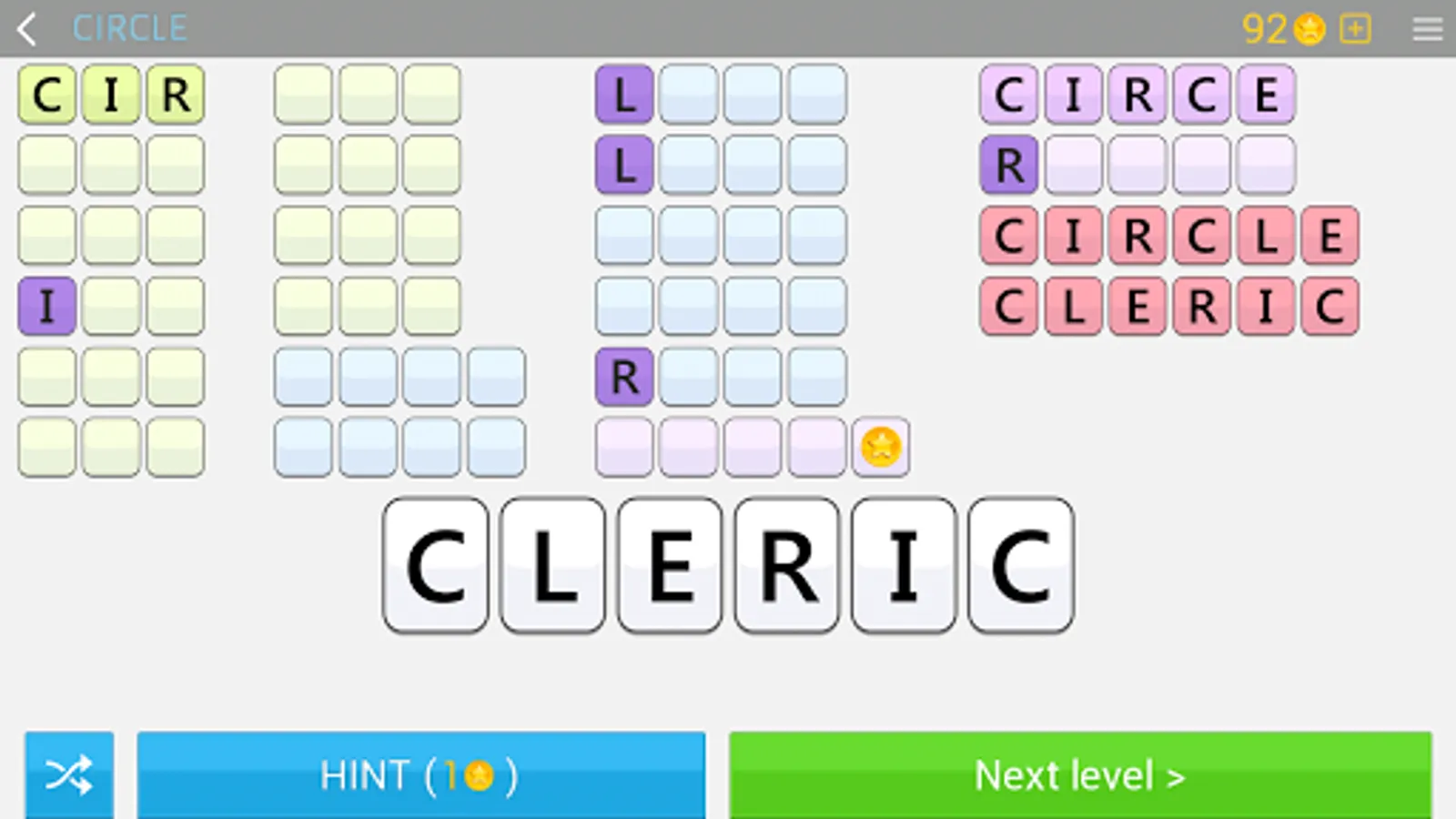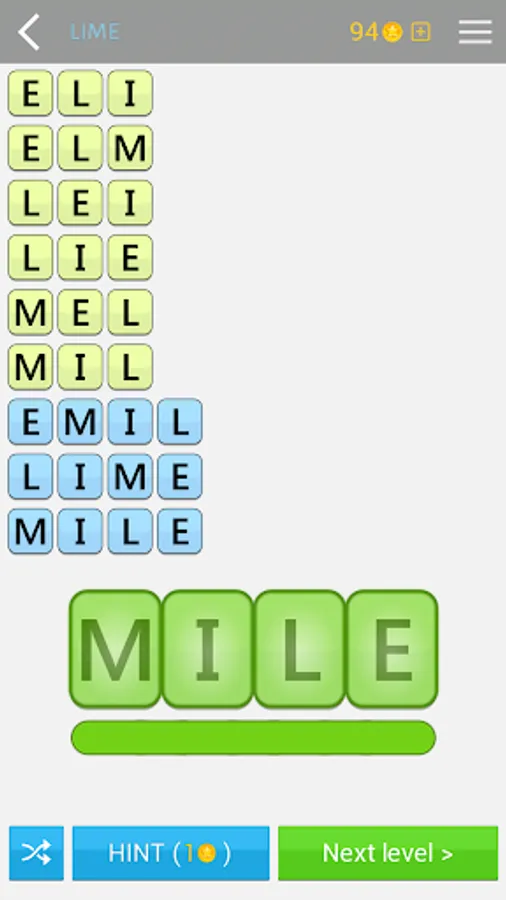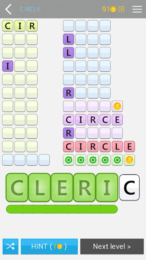 Each puzzle also has many hidden words that allow you to win coins. There are dozens and even hundreds of words in some puzzles. The main objective is to find at least one anagram of the given word, but you can find many other words of fewer letters.