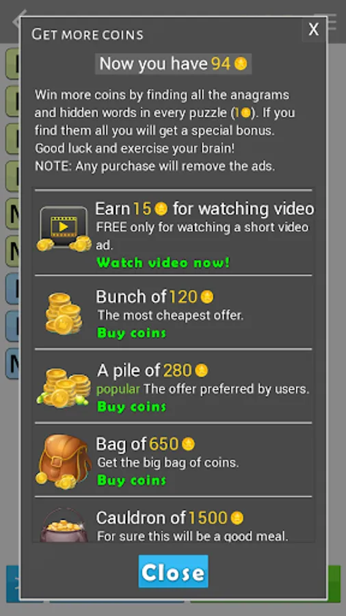 If you run out of coins, you can get more coins in many ways: By watching a short video ad, finding secret words or buying coins in the store.
