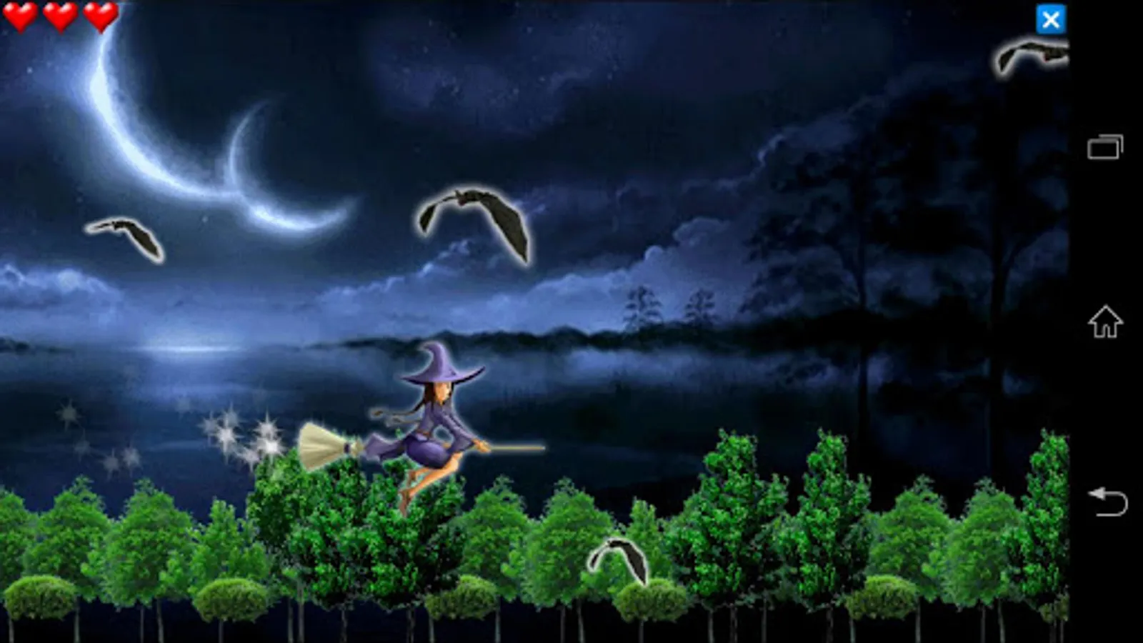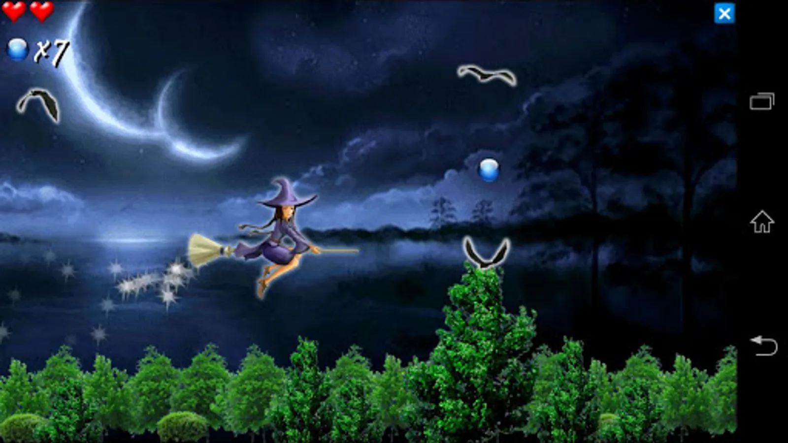 Help the cute little witch to escape through the magic forest. There are dangers lurking in the twilight! Avoid the giant bats and collect all the blue items.