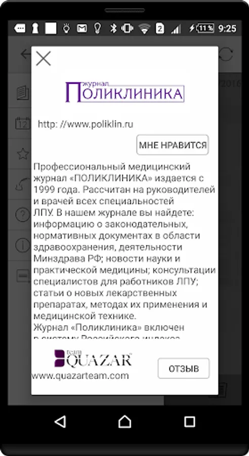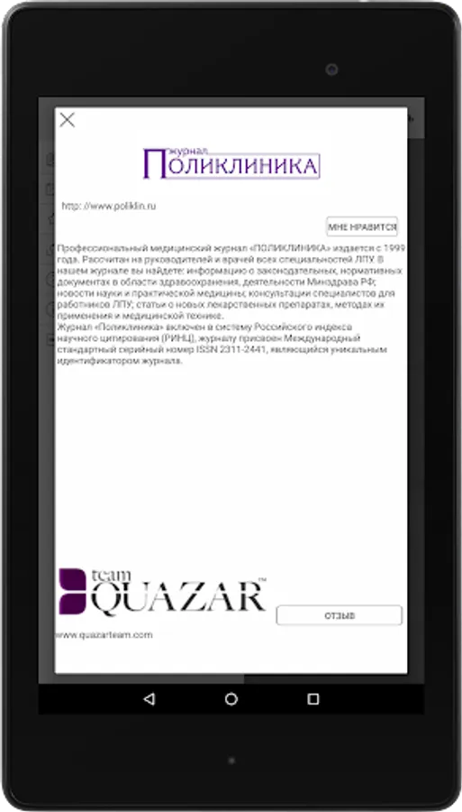 Appendix "magazine Polyclinic" offers FREE full version of the magazine. A distinctive feature of the application is to provide the opportunity to go directly to the site of the drug manufacturer, a supplier of medical equipment, services and other information that is presented in the printed version of the magazine, and in the application "Journal Polyclinic"