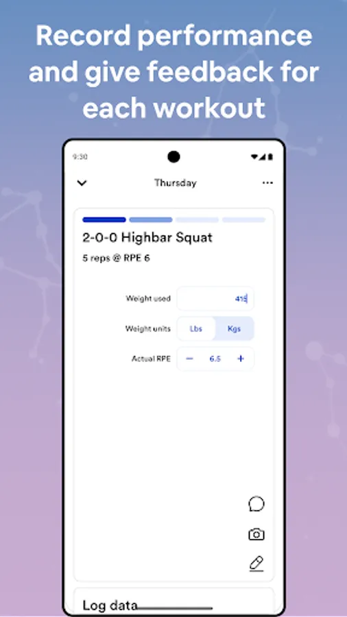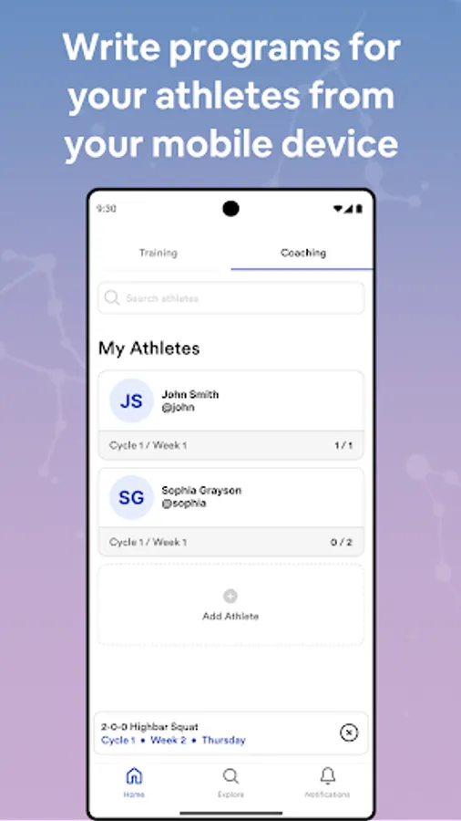 SquatLab for Clients allows you to add your coach, receive training programs that they write for you from the web app, and provide them with feedback on your sessions.