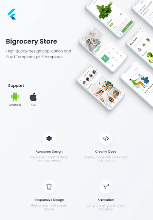 Bigrocery UI Kit Grocery can be use to make create application faster to save your time, for user interface kit in android and ios device, It contain have more 70 Screens with different type of UI.