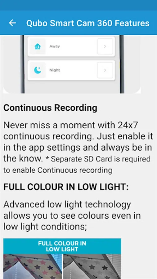 Qubo camera setup, features and frequently asked questions are mentioned in the mobile app. Working with different privacy modes, the qubo smartcam 360 can be set as night mode, home or outside mode according to your routine.