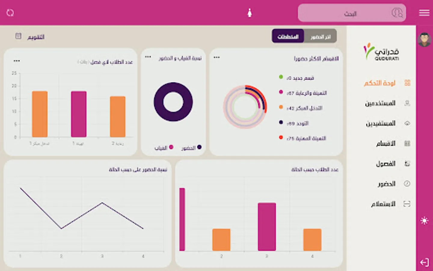 It also enables viewing attendance reports of students and determines the percentage of daily, monthly and annual attendance and absence.