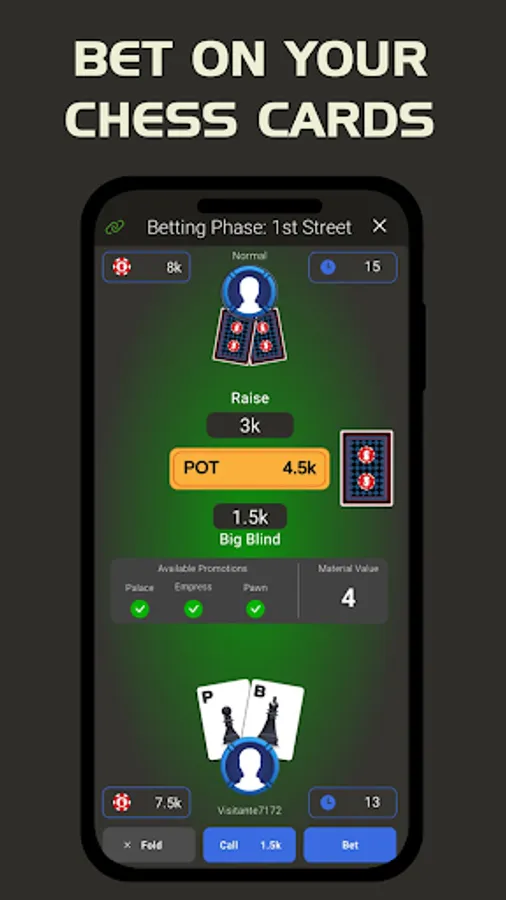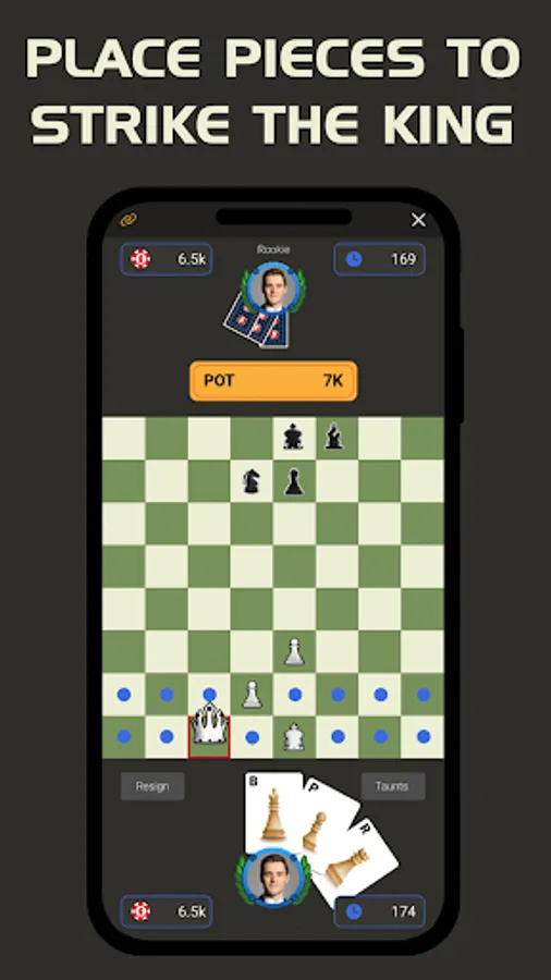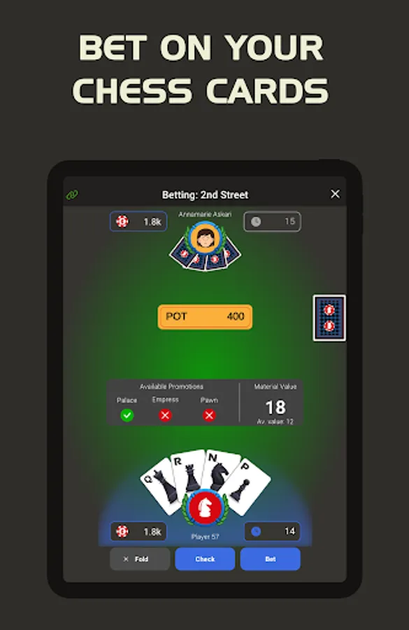 Chessino: 3 phases of intense gameplay that require clear thinking, cunning and ice cool calculation. In the initial card phase, you'll need street smarts to bluff, bully and outfox your opponent. In phase 2, it's time to place your pieces on the board and just like in a real battle, you decide where your forces go! Strategically, place them on the board to protect your King but also be ready to strike your opponent. Finally, when all the pieces are in position, it's pure chess. Whoever wins the chess phase, wins the Pot.