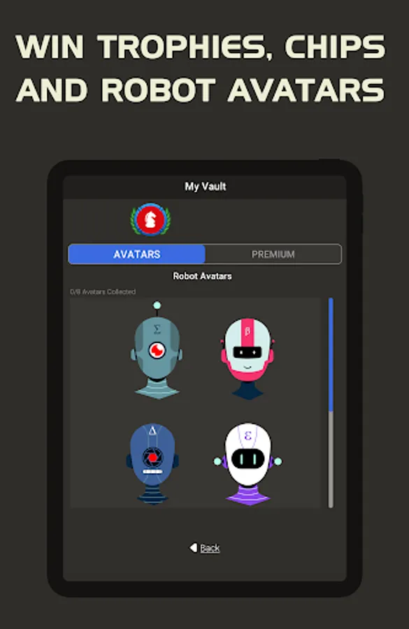 Robot Battle: Pit your wits against an army of ruthless, chess playing robots. Each Robot defends a city on the World Chessino Tour. Beat each Robot 4 times to unlock the city and win its avatar. Unlock all 7 cities to claim the precious robot chess set.