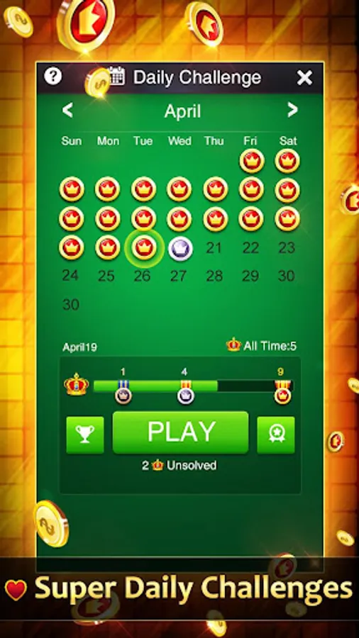 In Classic Solitaire (also known as Klondike or Patience), try to collect all the cards in 1 card or 3 card mode. Don’t forget to try the Vegas scoring mode as well!