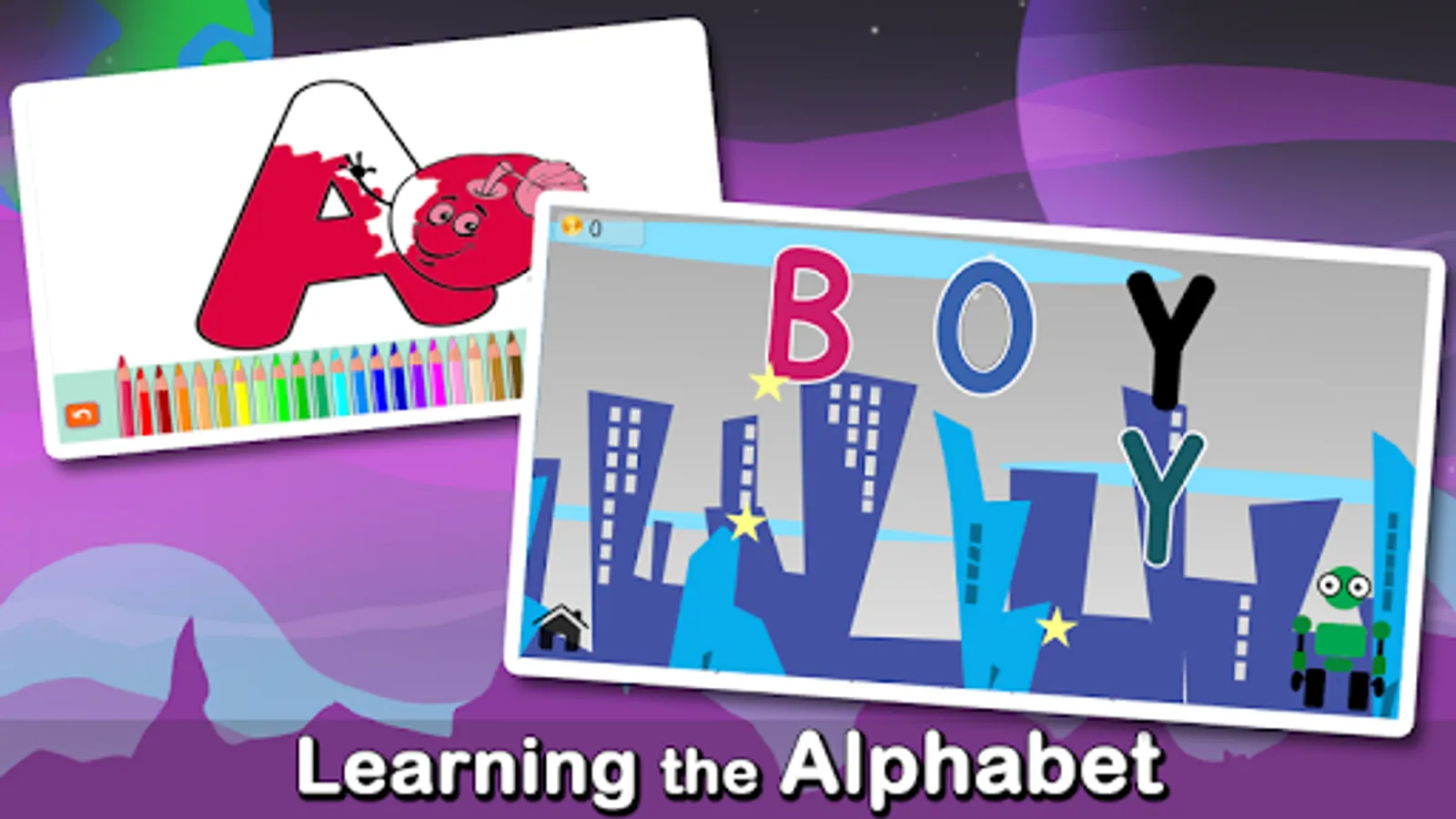 One of the most fun alphabet learning games with color recognition, learning spelling and phonics.