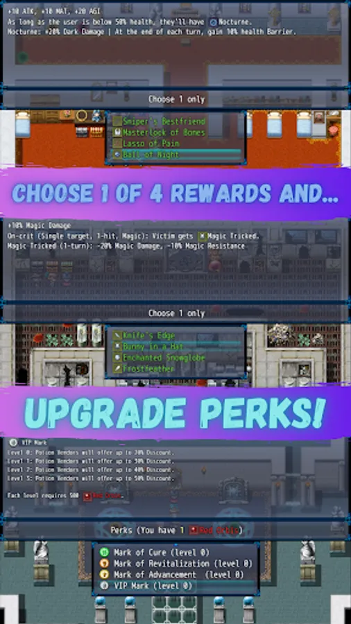 After winning battles, you choose 1 reward from 4 options—the classic roguelike way! And after each adventure, you gain an amount of Red Orbis depending on how far you have reached. You can use Red Orbis to upgrade Perks and spice up all your next adventures!