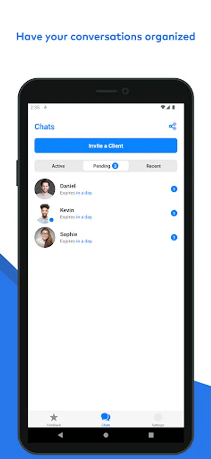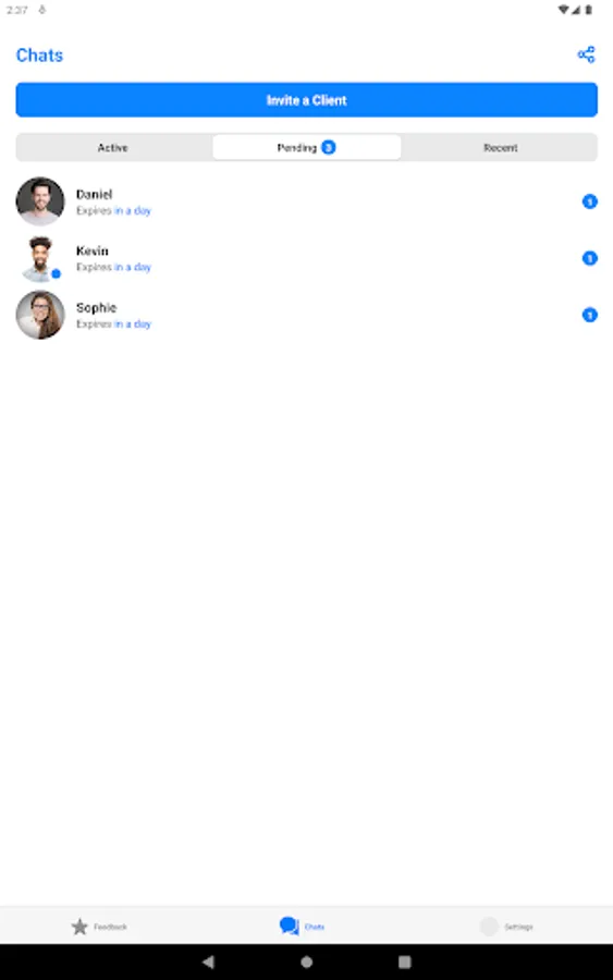 - You and your clients get Quester App (on Android or iPhone/iPad) and sign up - you can invite clients to chat with you by sharing a referral link