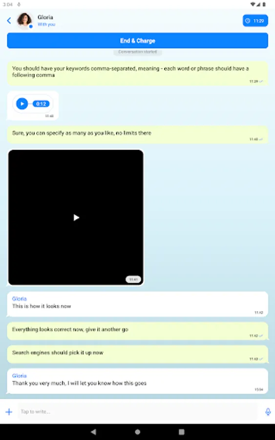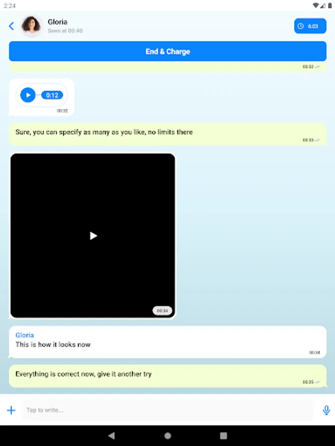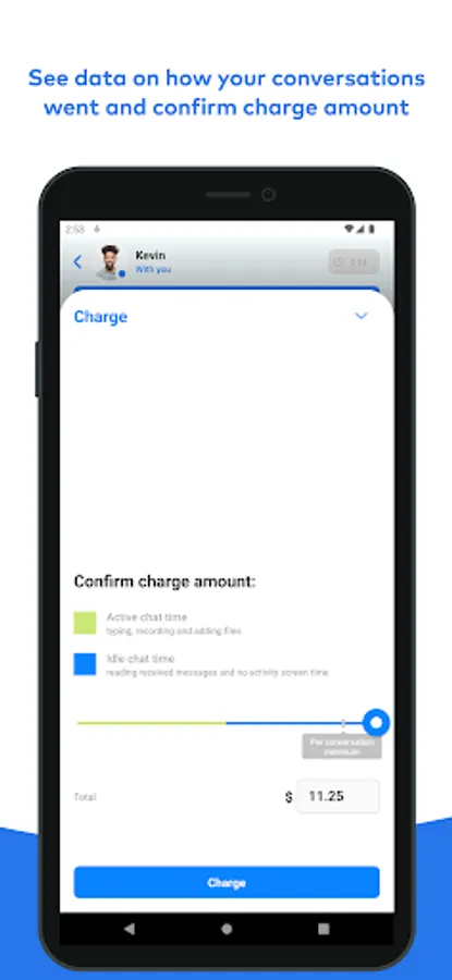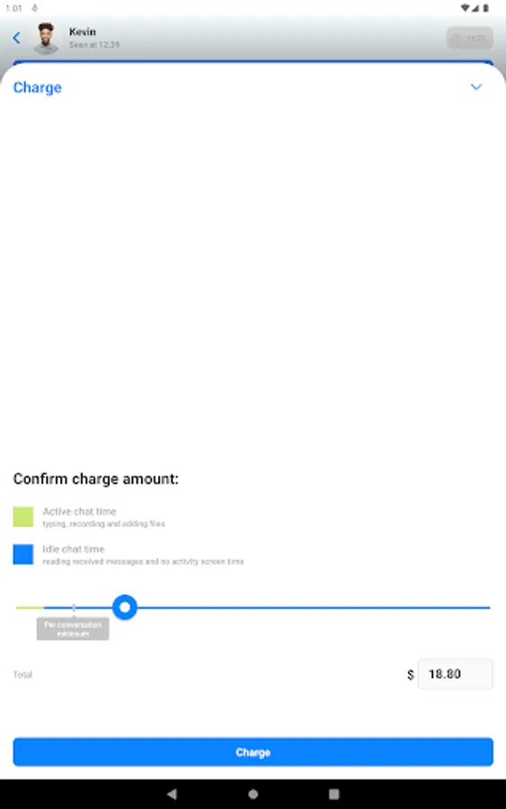 - After all the questions of client have been answered, you get to Charge screen with analysis of time spent and charge the client