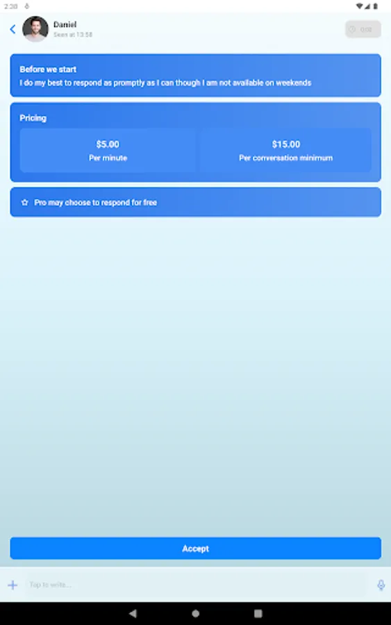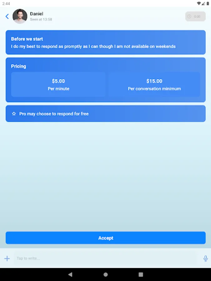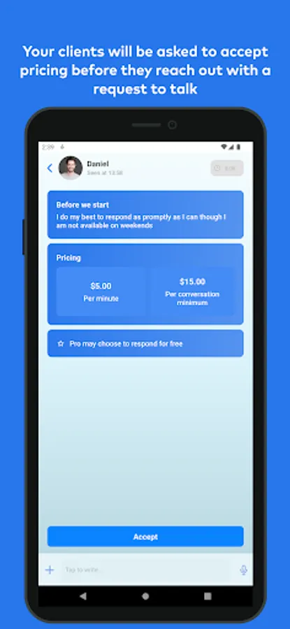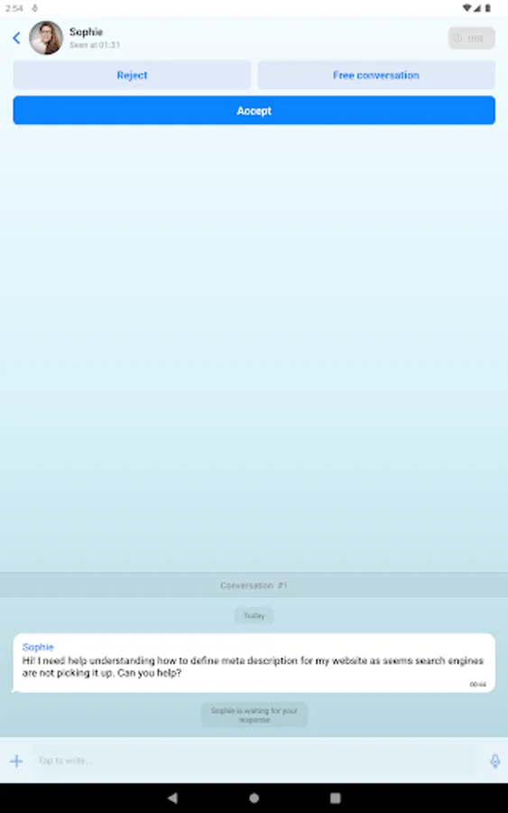 - You decide if you can help the client and to Accept conversation, Accept FREE conversation or Reject it with reasoning