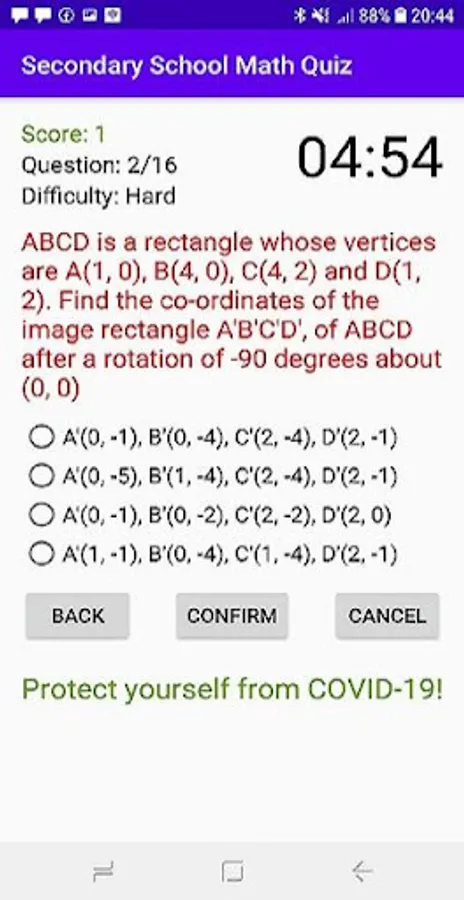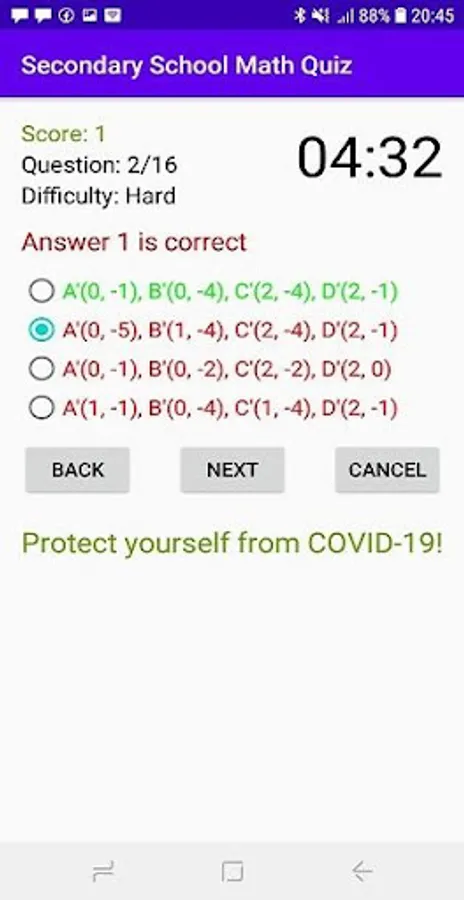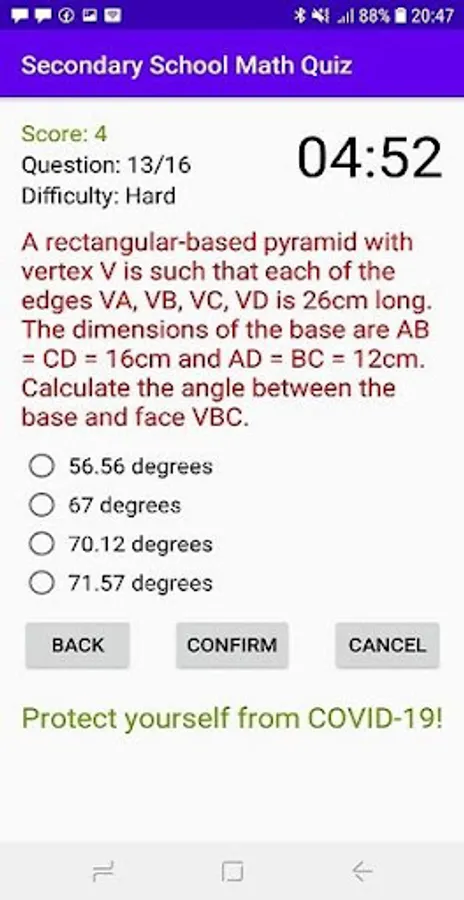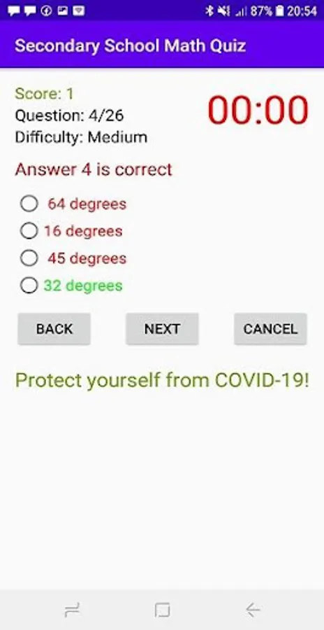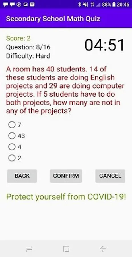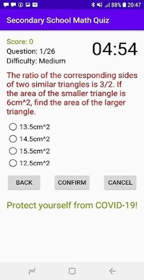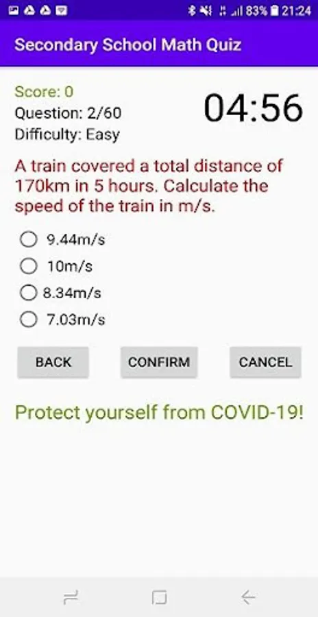 The application has questions from secondary or high school level. The questions have three difficulty levels which are easy, medium and hard. These questions are for forms 1, 2, 3 and 4 students or grades 9, 10, 11 and 12 students.