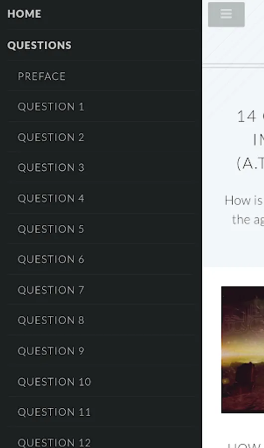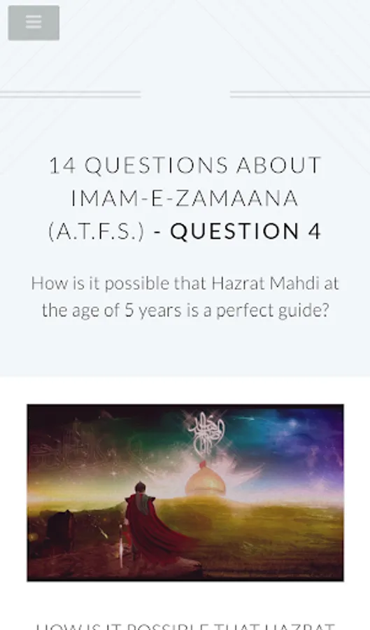 In this app the reader may learn some important proofs about Imam of our time Imam Al-Mahdi (a.t.f.s.) from authentic sources based within both Shia and Sunni schools of thought, as well as based on the Holy Quran and other ancient scriptures. The app is divided into fourteen separate questions and answers all of which eloquently describe his existence, his purpose, his birth and some of his merits (a.t.f.s.).