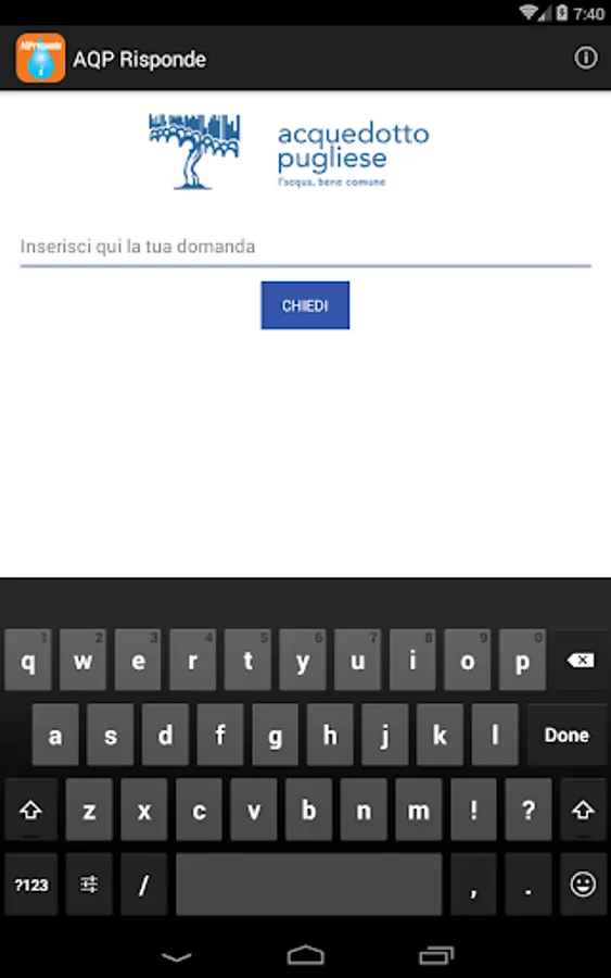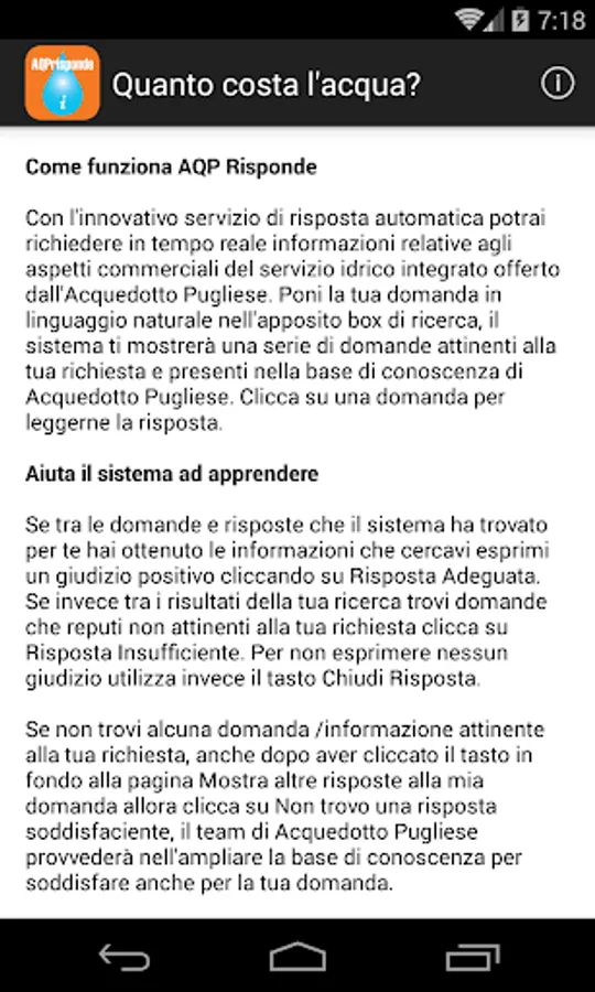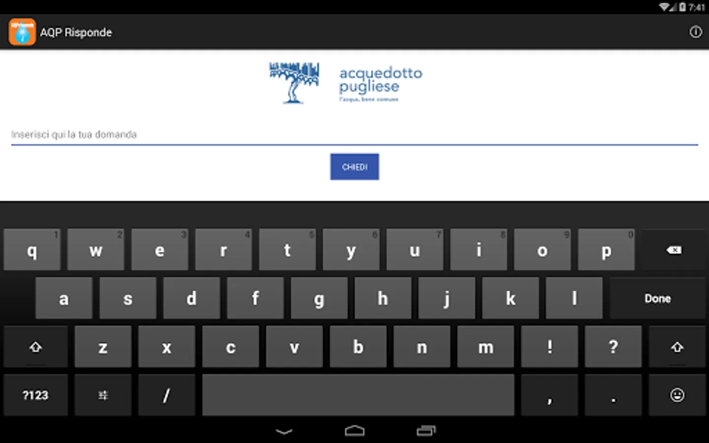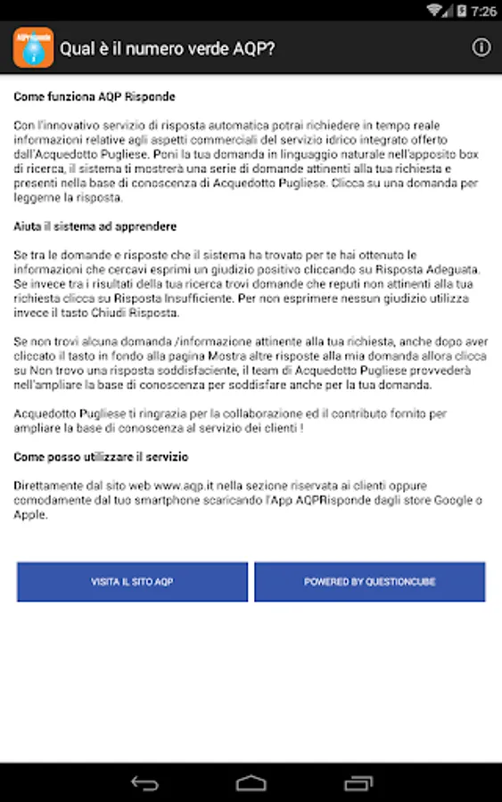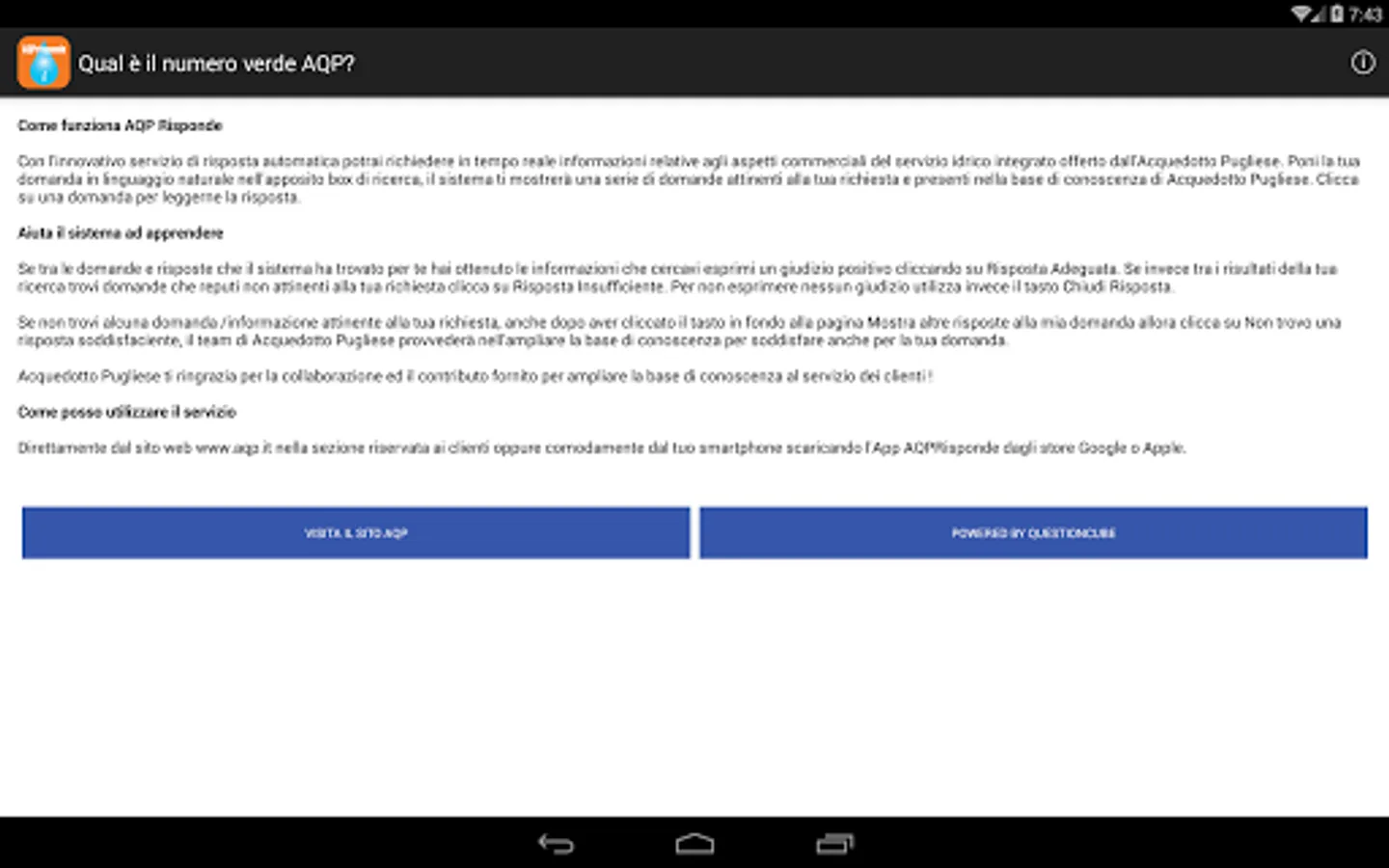 With the innovative automatic answering service you require real-time information relating to the commercial aspects of water service offered Aqueduct Pugliese. Post your question in natural language into the search box, the system will show you a series of questions relating to your request and in the knowledge base of Aqueduct Pugliese. Click on a question to read the answer.
