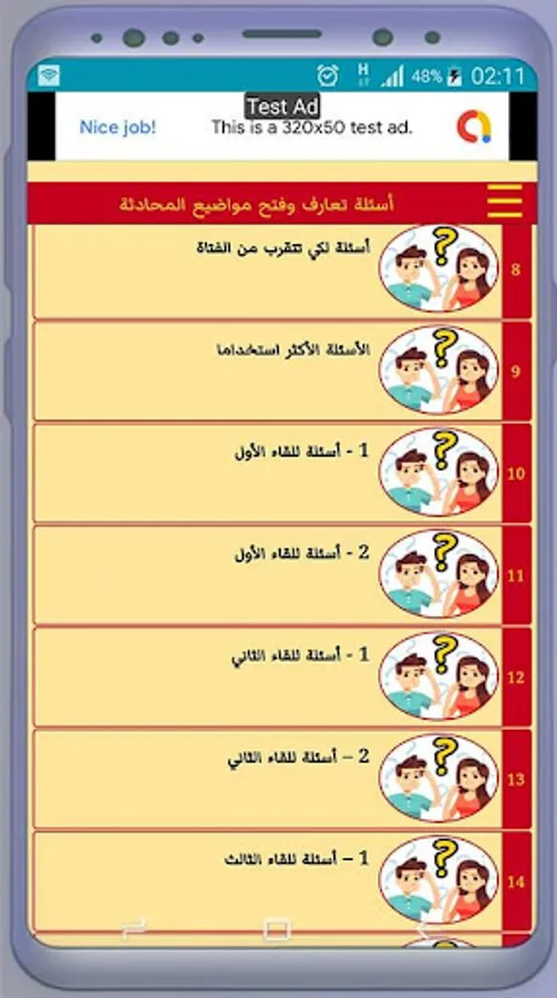 With this application, you will find topics for discussion and questions, frankly, for the lover and for the beloved, in order to learn how to make a girl love you madly, and also how to make a man love you madly, or the correct way to talk to anyone who liked you.