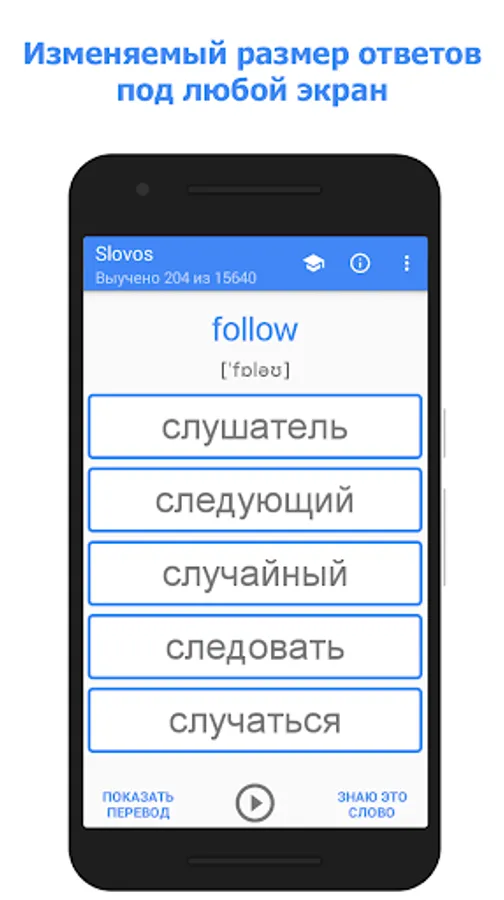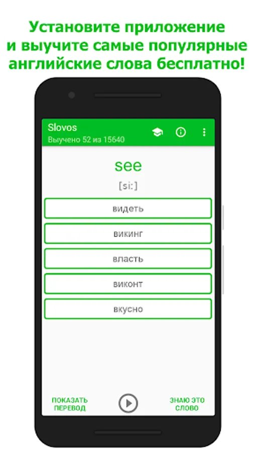 The Slovos app contains 15,000 of the most popular English words. The list includes absolutely all parts of speech, as well as all forms of irregular verbs. In compilation, the Corpus of Modern American English was used. Its main difference is that the Corpus contains 520 million words and is balanced across genres. Words are sorted by popularity. At the very beginning, there are the simplest and most popular, which can be found almost everywhere. That is, at the beginning, the application will not offer you to learn, for example, the word gabelle (tax on salt), but will leave the word good for later.