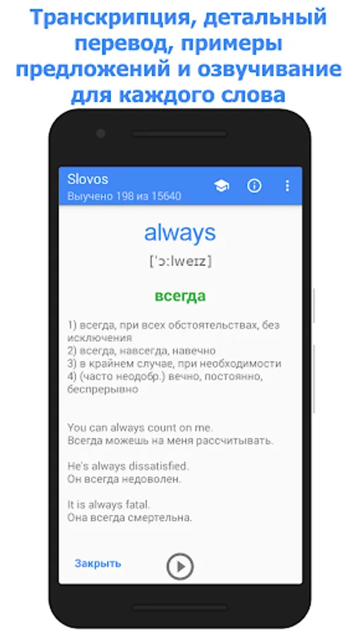 Learning English words is easy with the Slovos app. If you are going to learn English, then first of all you need to have a good vocabulary in order to quickly learn grammar and other rules and, as a result, understand the interlocutors and speak fluently. The application contains 15,000 of the most popular English words. The training starts with the most popular ones. When sorting, we used the vocabulary corpuses of the modern British and American languages, which consist of materials on various topics. Therefore, if you learn English words using the Slovos application, then you can easily read and understand most articles, news, books, films or conduct a dialogue.
