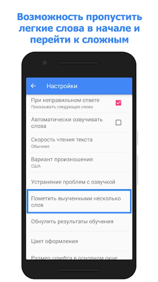 - If learning English is not new for you, but you want to quickly increase your vocabulary, then the application has a function that makes it possible to skip 100, 500, 1000 or any number of english words and start not with simple ones, but with more complex ones ...