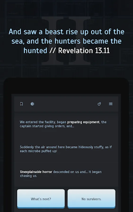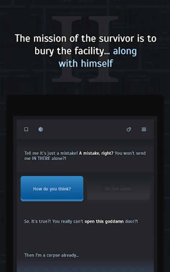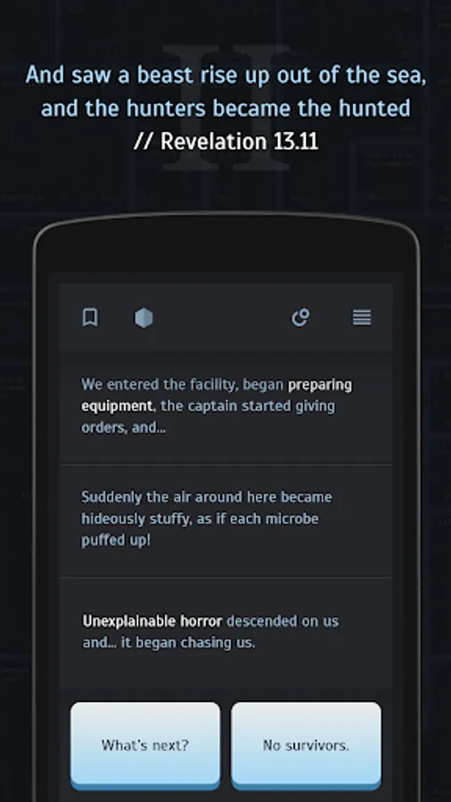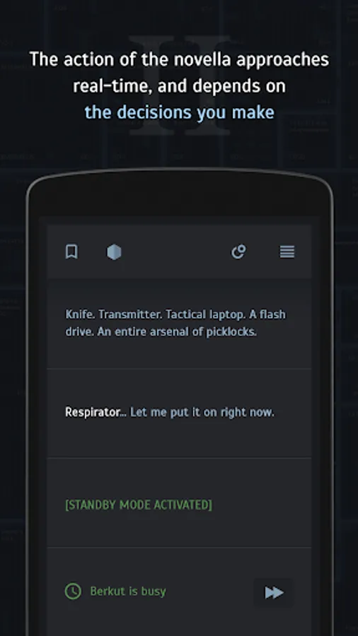 The text quest action approaches real-time. The main character will get in touch with you, tell you all about what’s going on his end, and also ask for help and advice. Sometimes he’ll need time to act or maybe just rest. Every one of our decisions influences the course of the story, both salvation of humanity and its extinction are in your hands.