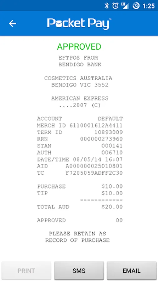 3. The bank will process the transaction, with a response sent to your Smart device advising if the transaction has been approved or declined. You can then send the receipt directly to your customer’s phone via SMS, email or optionally print a receipt on an approved Bluetooth Printer.