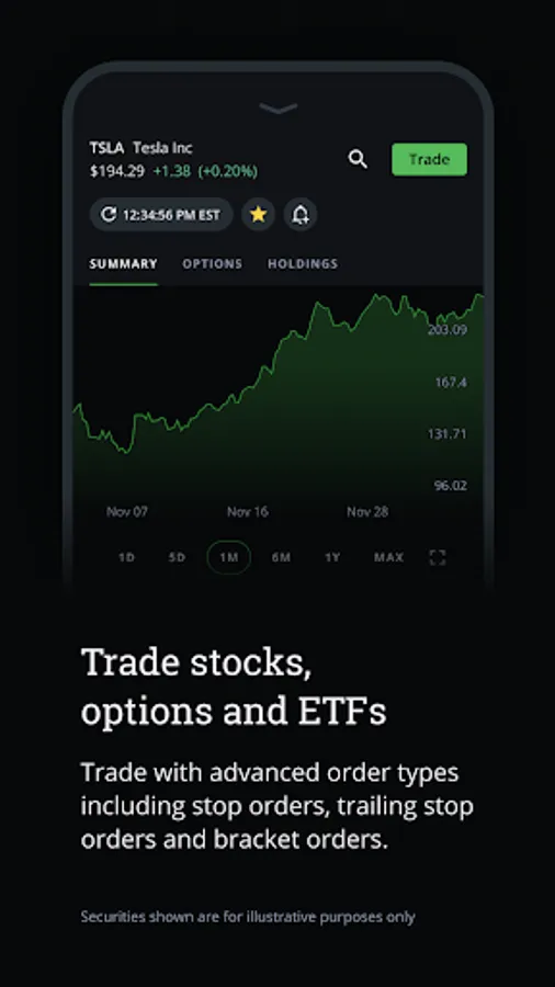 - Advanced order types including stop and trailing stop orders, option orders and bracket orders