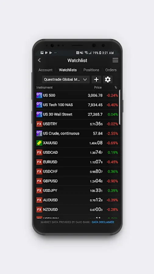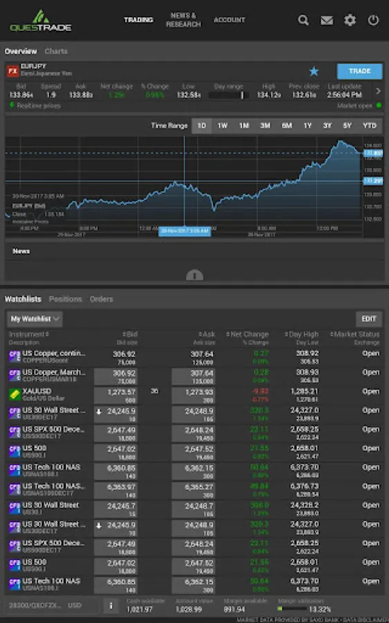 Questrade Global Mobile allows you to access the world’s largest financial market on the go. Whether trading global indices, stock CFDs, commodities or currencies, you’ll always be connected to your Questrade FX & CFD account.