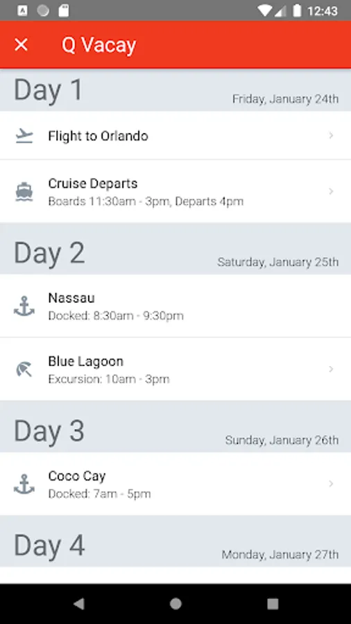 Itinerary of flight, cruise and excursion details