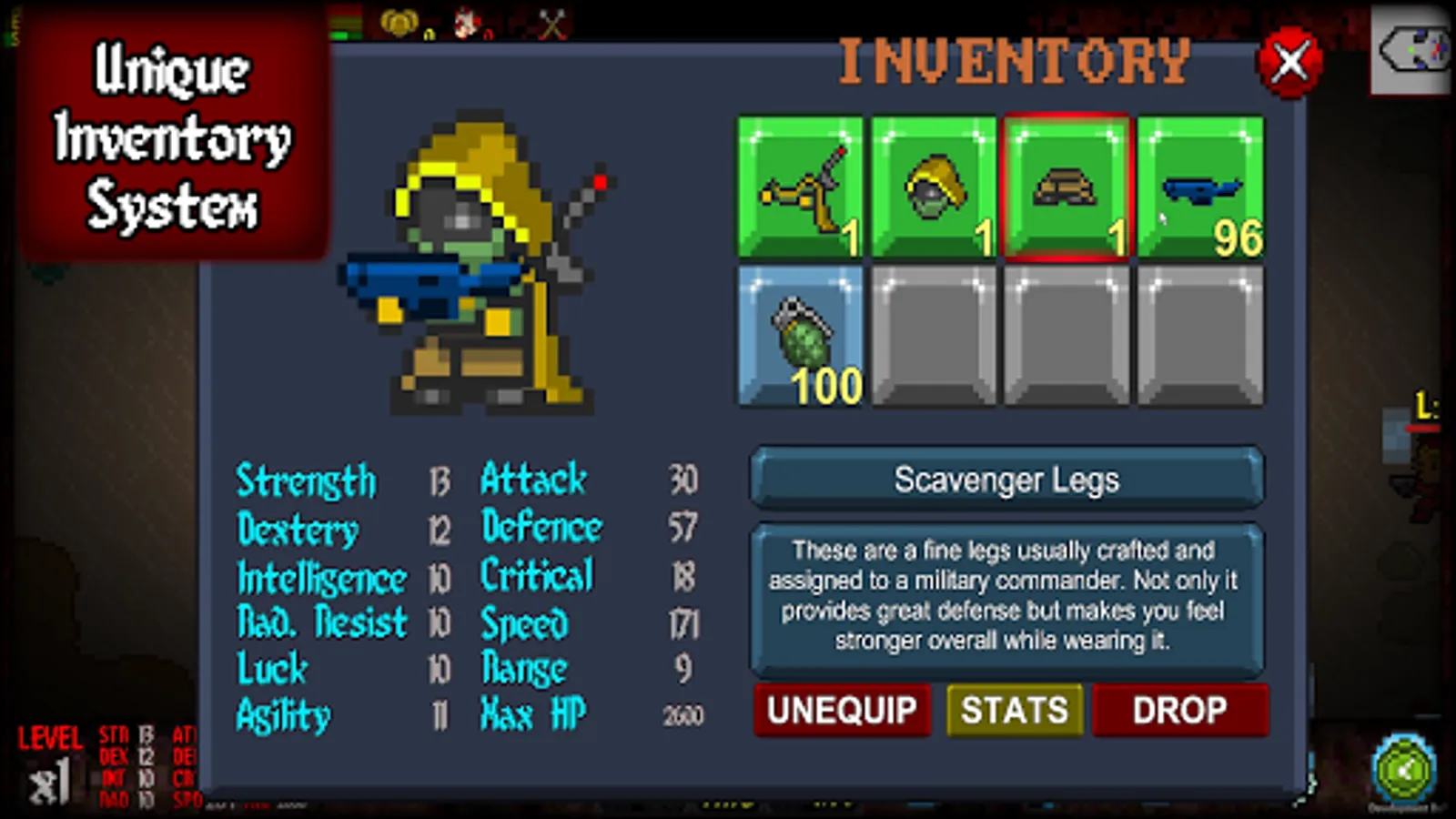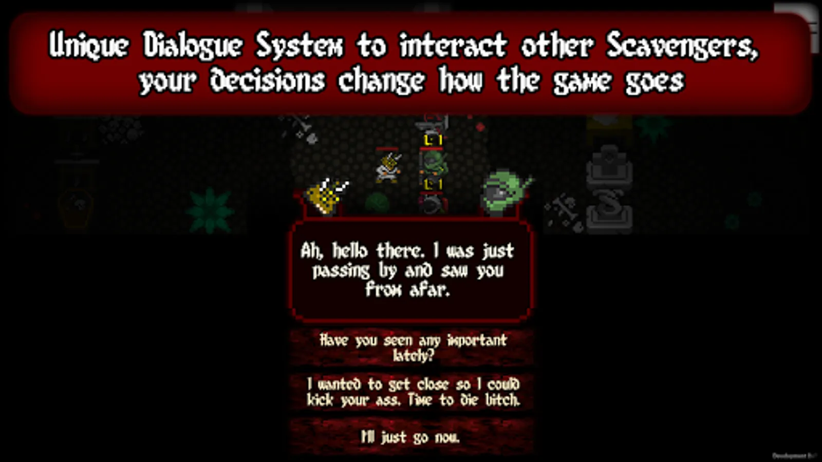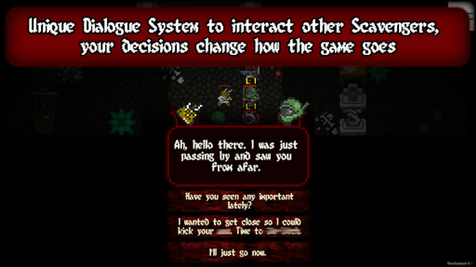 Classical turn-based roguelike* styled game, with pixel art graphics. It's a post-apocalyptic era where you need to scavenge supplies and weapons to survive.