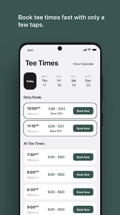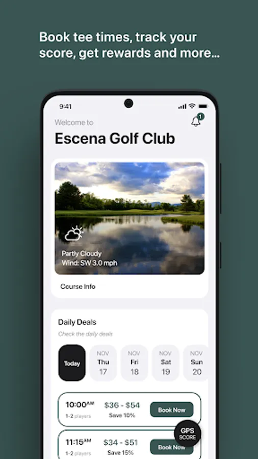 Booking a tee time is as easy as 3-taps and once you've setup your account the app will remember you so its always 3-taps. You can always look up your reservations and cancel reservations if you need to as well. Plus view and redeem your rewards or promotion codes anytime.