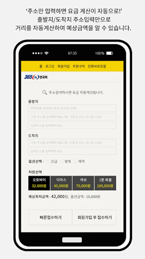 365 nationwide Quick is a service that you can easily use the quick service (motorcycle, Damas, Labo, 1 ton cargo) you need with a mobile app.