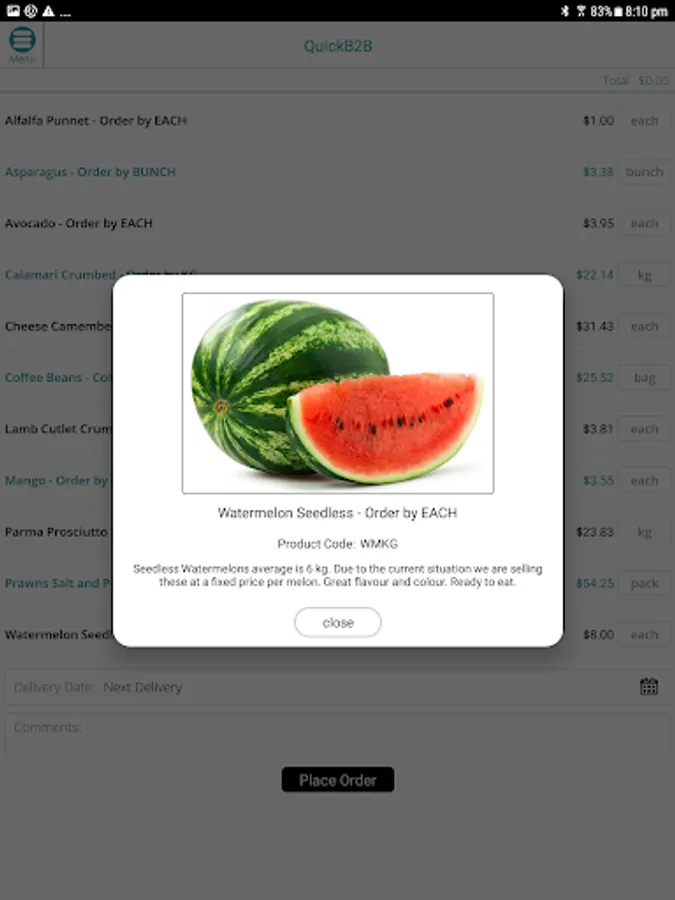 Each Wholesaler offers different fresh produce like Fruit & Vegetables, Meat, Seafood , Breads, Cakes, Yogurts and more. They offer pick up or delivery. Check out the App Information page in your menu for delivery details.