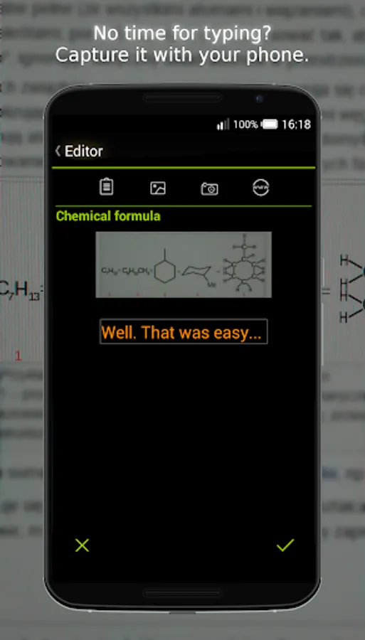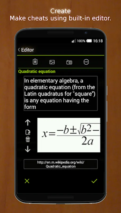 Compose your cheats and use them on tests. Write your own notes or choose text from existing file. Add additional links to enrich the experience.Take photos and pick images from gallery. While you are at it , crop them from the app!