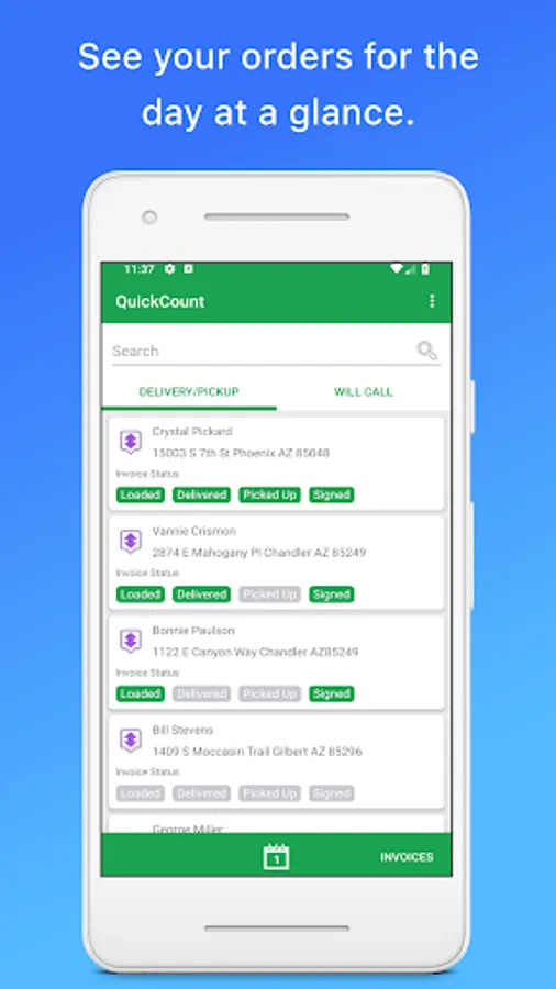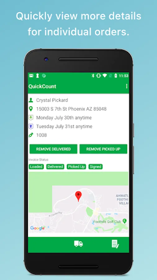 The QuickCount Mobile App is a companion to the QuickCount Inventory Tracker software. With the app, you can view your rental orders, update the status of a delivery, pick up, or will call order, view items for loading trucks for deliveries and generate digital contracts for customers to sign when accepting rental items.