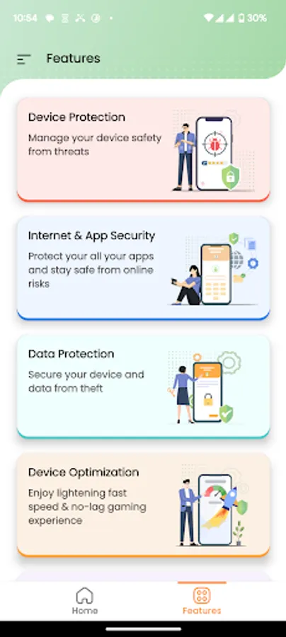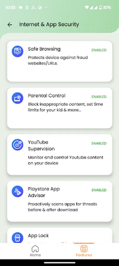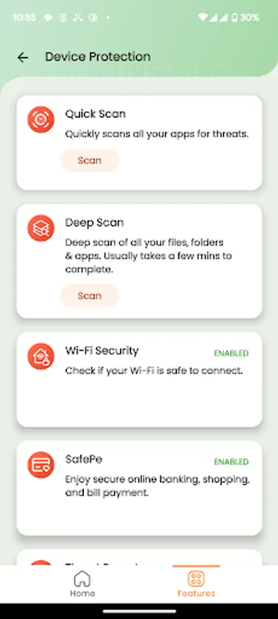 • Scans apps before and after downloading from Play Store to ensure safety and offers customized scan options including on-demand Quick and Full scan, Scheduled Scan