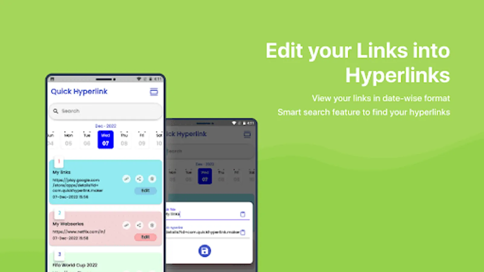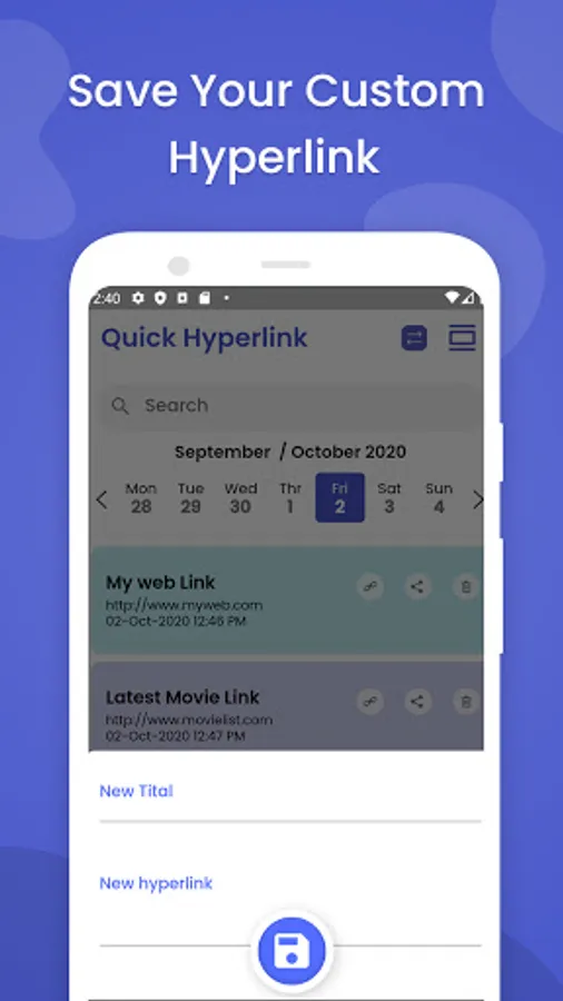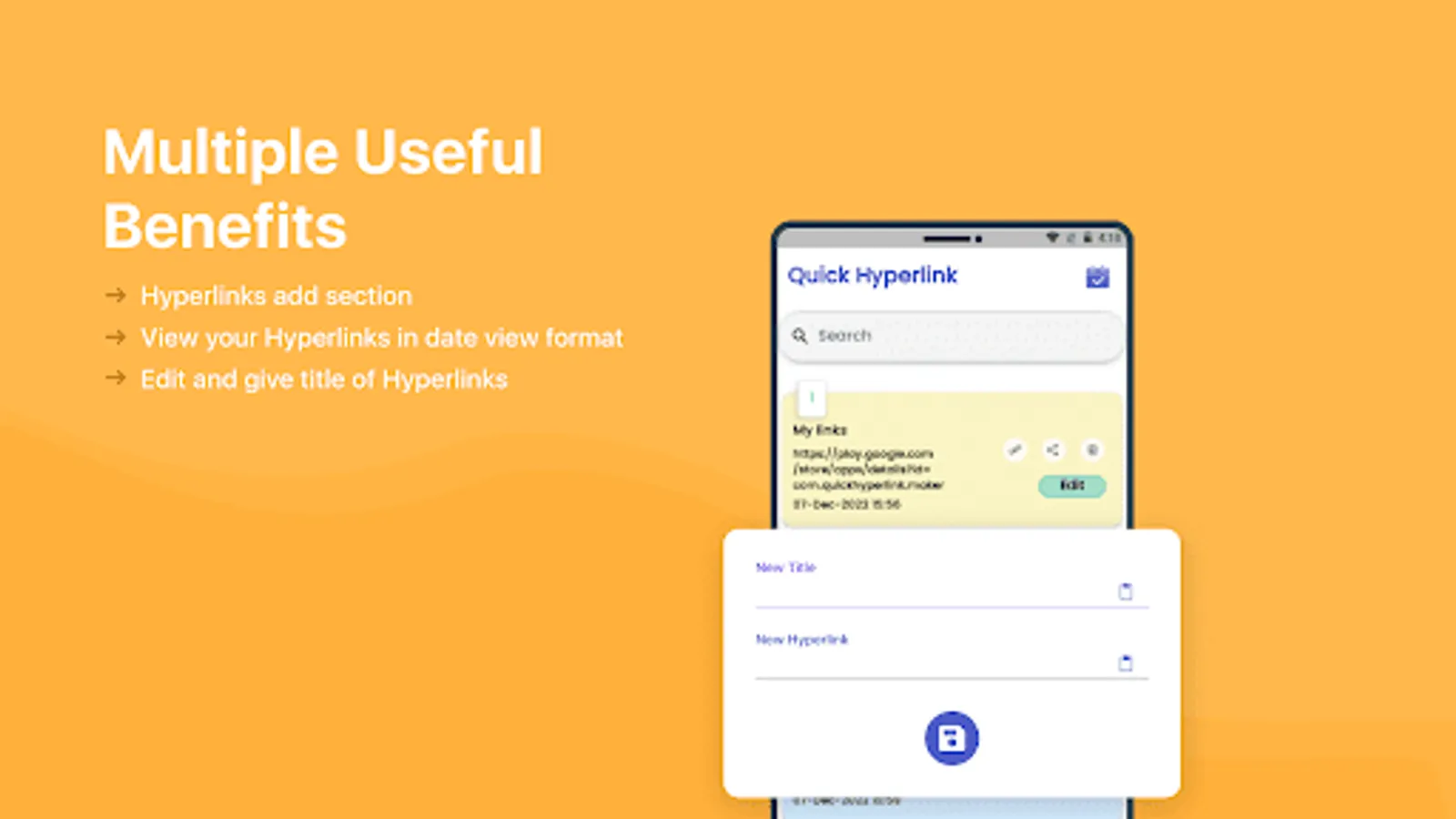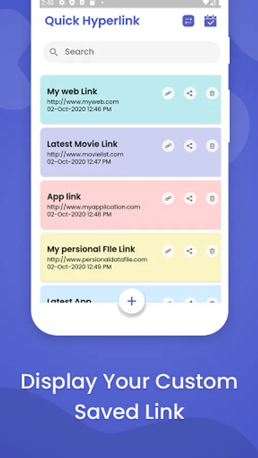 A "Quick hyperlink maker" application is a specific type of link that a web browser typically responds to by loading a new web page. With the help of this app, anyone can easily save the link and open it with a single click as well as search with the saved title name. Here you can save your favorite link and open it easily with a single click.