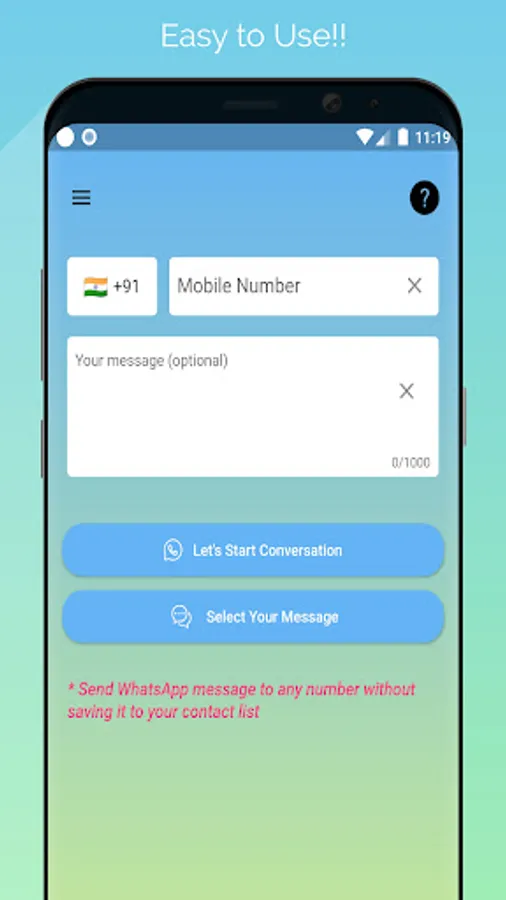 WhatsApp will notify you if the new phone number does not exist on WhatsApp Easy Message app makes your life convenient. We know it’s a feels like a daunting task to add a temporary number in order to send WhatsApp message. Your contact list is flooded with lots of unnecessary contacts just because you needed to send WhatsApp message to them once. Now send direct WhatsApp message to any phone number effortlessly. Easy message Text without saving phone number.