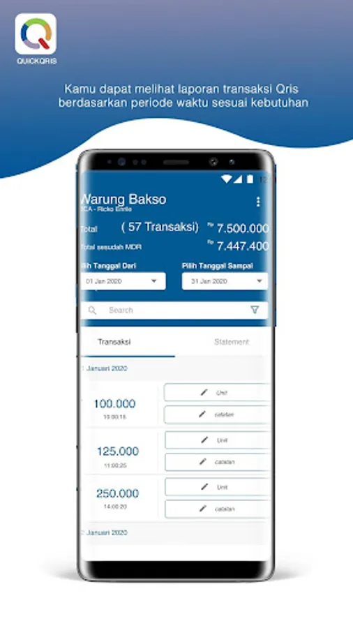 Through QUICKQRIS QRIS transaction reports can be viewed easily, you can continuously monitor your business performance, see your sales and income in real time and download the results of your monthly transaction recapitulation.