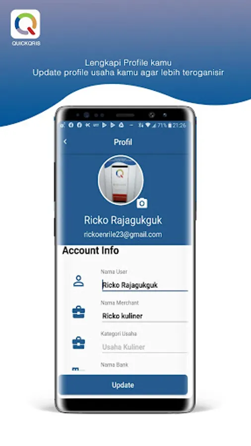 Make sure the gmail account you use when registering with QUICKQRIS is a gmail account that has been registered as a QRIS partner issued by the Bank.